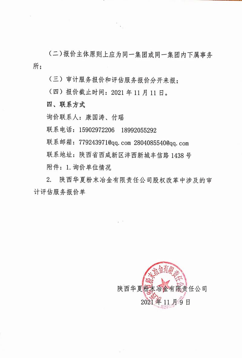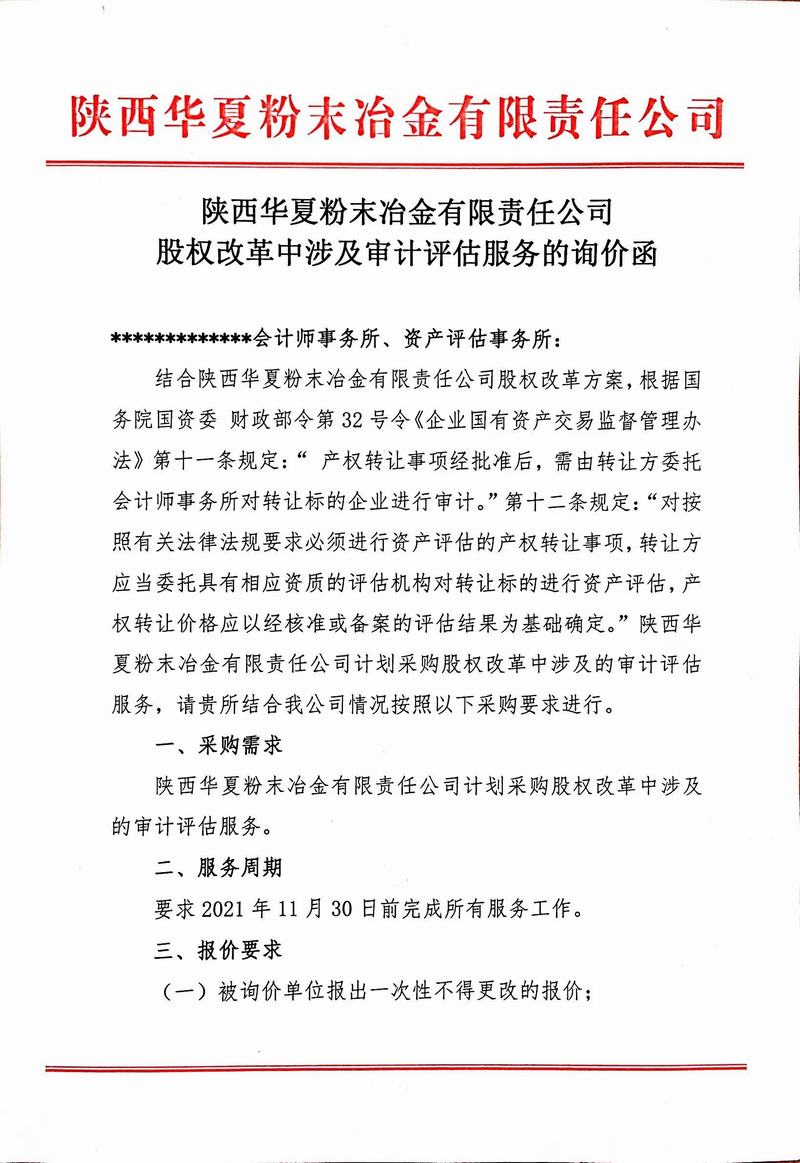 陜西華夏粉末冶金有限責(zé)任公司股權(quán)改革中涉及審計(jì)評(píng)估服務(wù)的詢價(jià)函