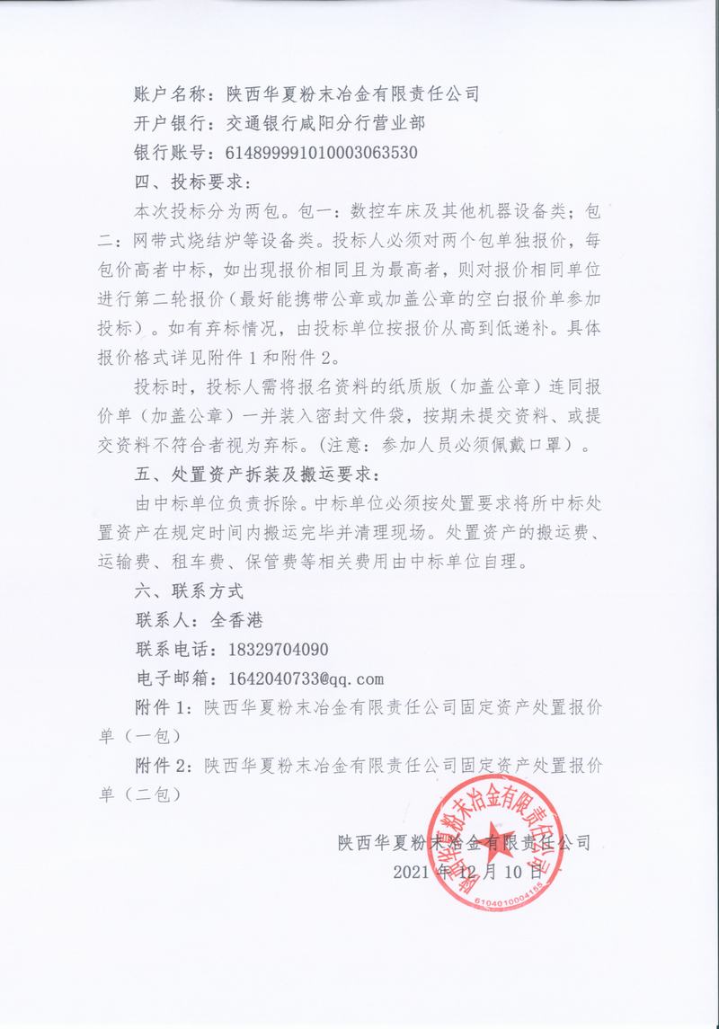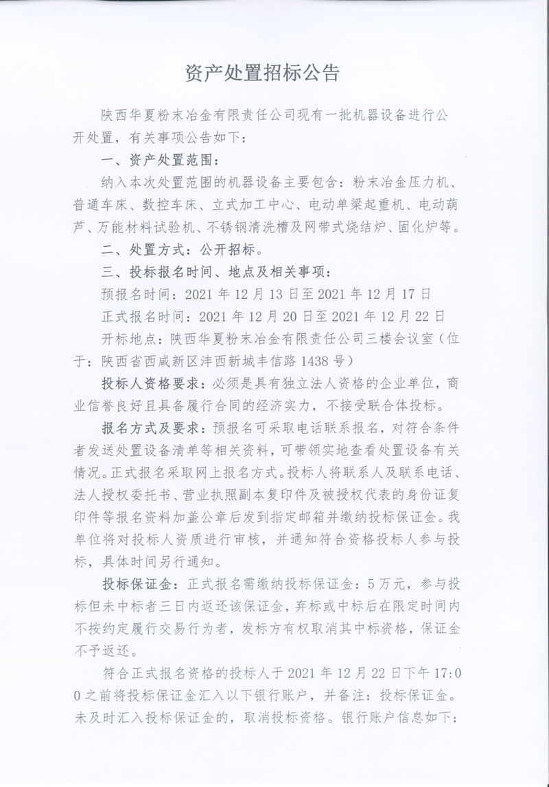 陜西華夏粉末冶金有限責任公司現(xiàn)有一批機器設(shè)備進行公開處置,有關(guān)事項公告如下: