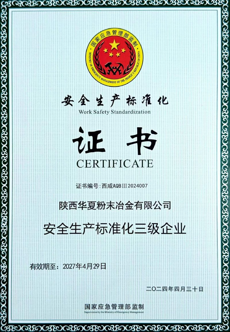 近日,陜西華夏粉末冶金有限責任公司正式獲得安全生產(chǎn)標準化資質(zhì),這是公司安全生產(chǎn)歷程中的一座重要里程碑。安全生產(chǎn)標準化涵蓋了從生產(chǎn)設(shè)施到人員操作、從風險評估到應(yīng)急管理等一系列環(huán)節(jié),此資質(zhì)標志著華夏公司在安全生產(chǎn)管理體系建設(shè)、安全操作規(guī)范執(zhí)行和全體員工嚴謹落實安全措施等安全生產(chǎn)各方面都達到了高標準。